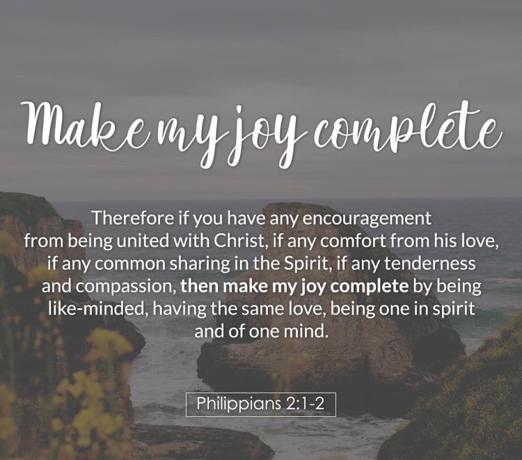 Is there any encouragement from belonging to Christ? Any comfort from his love? Any fellowship together in the Spirit? Are your hearts tender and compassionate? Then make me truly happy by agreeing wholeheartedly with each other, loving one another, and working together with one mind and purpose. -Philippians 2:1-2 NLT