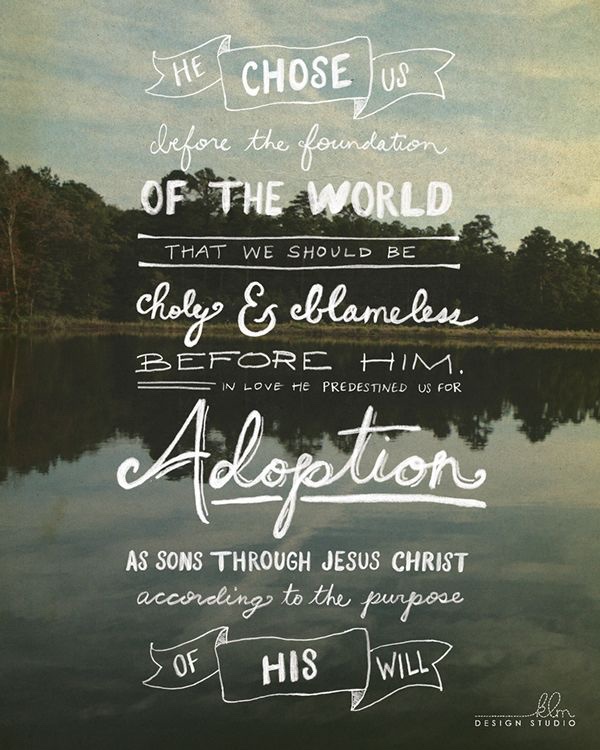 Blessed be the God and Father of our Lord Jesus Christ, who has blessed us in Christ with every spiritual blessing in the heavenly places, even as he chose us in him before the foundation of the world, that we should be holy and blameless before him. In love he predestined us[a] for adoption to himself as sons through Jesus Christ, according to the purpose of his will, to the praise of his glorious grace, with which he has blessed us in the Beloved. -Ephesians 1:3-6