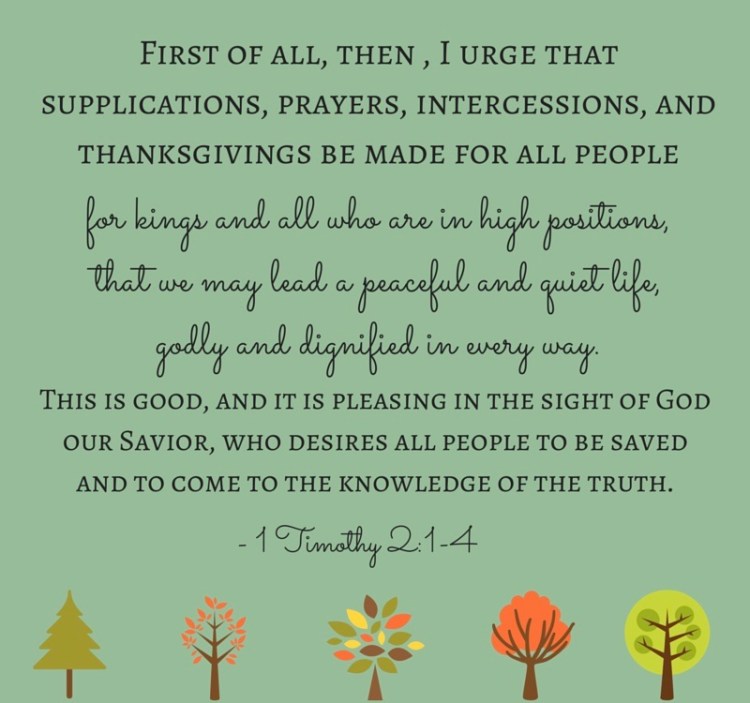 I urge you, first of all, to pray for all people. Ask God to help them; intercede on their behalf and give thanks for them. Pray this way for kings and all who are in authority so that we can live peaceful and quiet lives marked by godliness and dignity. This is good and pleases God our Savior, who wants everyone to be saved and to understand the truth. – 1 Timothy 2:1-4 (NLT)