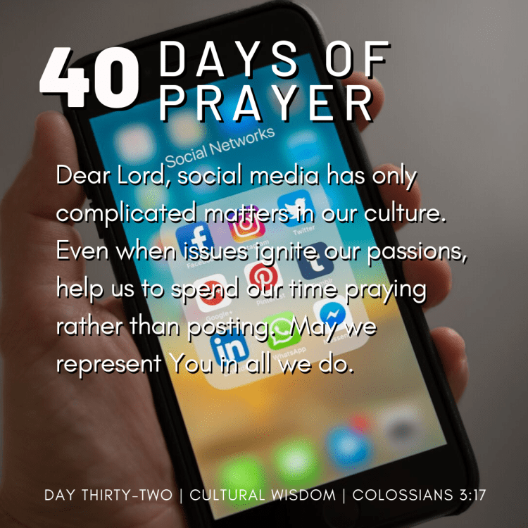 Pray | Dear Lord, social media has only complicated matters in our culture. Even when issues ignite our passions, help us to spend our time praying rather than posting. May we represent You in all we do.