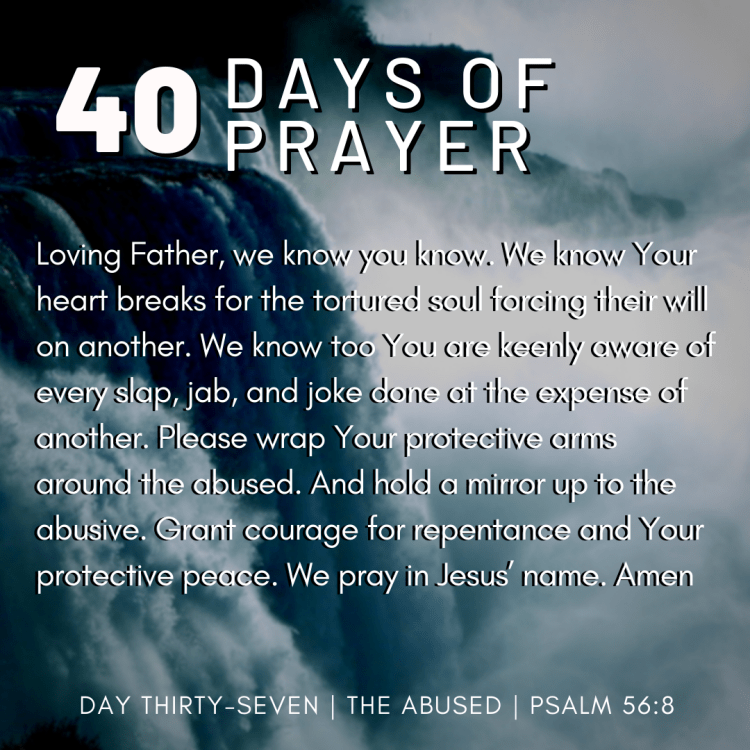 Pray | Loving Father, we know you know. We know Your heart breaks for the tortured soul forcing their will on another. We know too You are keenly aware of every slap, jab, and joke done at the expense of another. Please wrap Your protective arms around the abused. And hold a mirror up to the abusive. Grant courage for repentance and Your protective peace. We pray in Jesusβ name. Amen