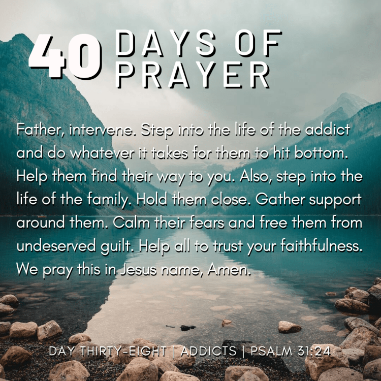 Pray | Father, intervene. Step into the life of the addict and do whatever it takes for them to hit bottom. Help them find their way to you. Also, step into the life of the family. Hold them close. Gather support around them. Calm their fears and free them from undeserved guilt. Help all to trust your faithfulness. We pray this in Jesus name, Amen.