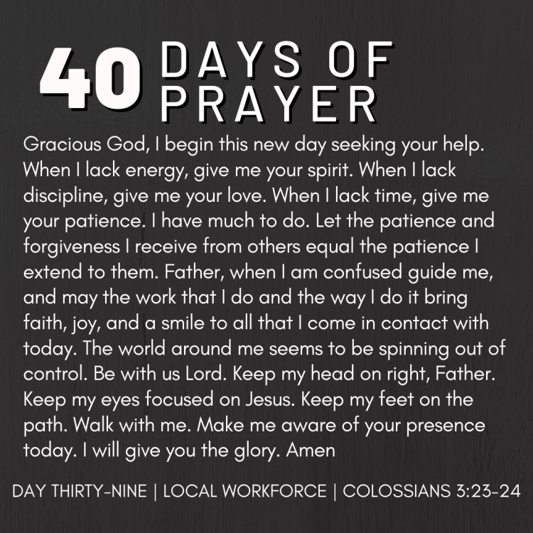 Pray | Gracious God, I begin this new day seeking your help. When I lack energy, give me your spirit. When I lack discipline, give me your love. When I lack time, give me your patience. I have much to do. Let the patience and forgiveness I receive from others equal the patience I extend to them. Father, when I am confused guide me, and may the work that I do and the way I do it bring faith, joy, and a smile to all that I come in contact with today. The world around me seems to be spinning out of control. Be with us Lord. Keep my head on right, Father. Keep my eyes focused on Jesus. Keep my feet on the path. Walk with me. Make me aware of your presence today. I will give you the glory. Amen