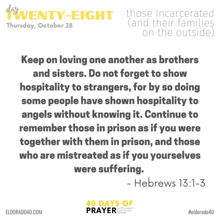 CONSIDER: The author of Hebrews tells us to remember those who are in prison. He does not give us an explanation as to why they are in prison. He simply says, ‘remember those in prison.’ Then he instructs us to identify with those in prison by saying, ‘as if you were together with them in prison.’ In another words, try to put yourselves in their shoes. Think about what they face each day and what they are going through in their condition. More than 5 million children, or one in 14, in the U.S. have had a parent in state or federal prison at some point in their lives, according to the Casey Foundation. We are not to ignore the many families who are dealing with life without a father or mother at home due to a prison sentence. Hebrews 13:3 tells us to keep on loving one another. This means showing hospitality to those who need it. This means we seek to reach out to those who are facing life without a significant family member.