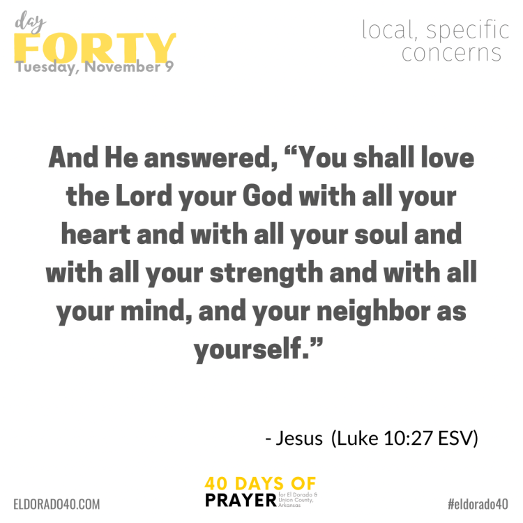 Thank you for participating in our 7th annual 40 Days of Prayer campaign for El Dorado and Union County, Arkansas. We’d also like to thank the ministry leaders representing the churches across the county for contributing to the creation of the prayer content for this campaign.