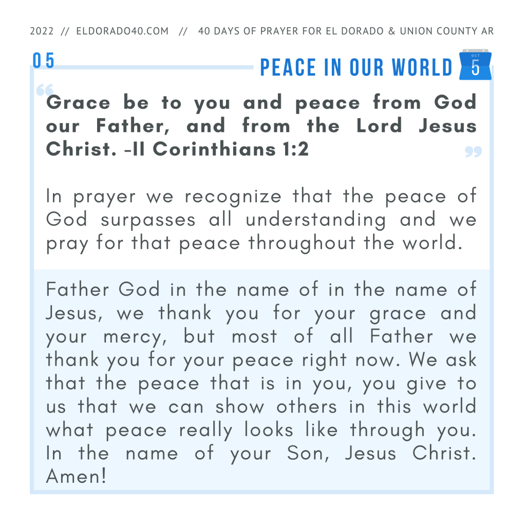 Father God in the name of in the name of Jesus, we thank you for your grace and your mercy, but most of all Father we thank you for your peace right now. We ask that the peace that is in you, you give to us that we can show others in this world what peace really looks like through you. In the name of your Son, Jesus Christ. Amen!