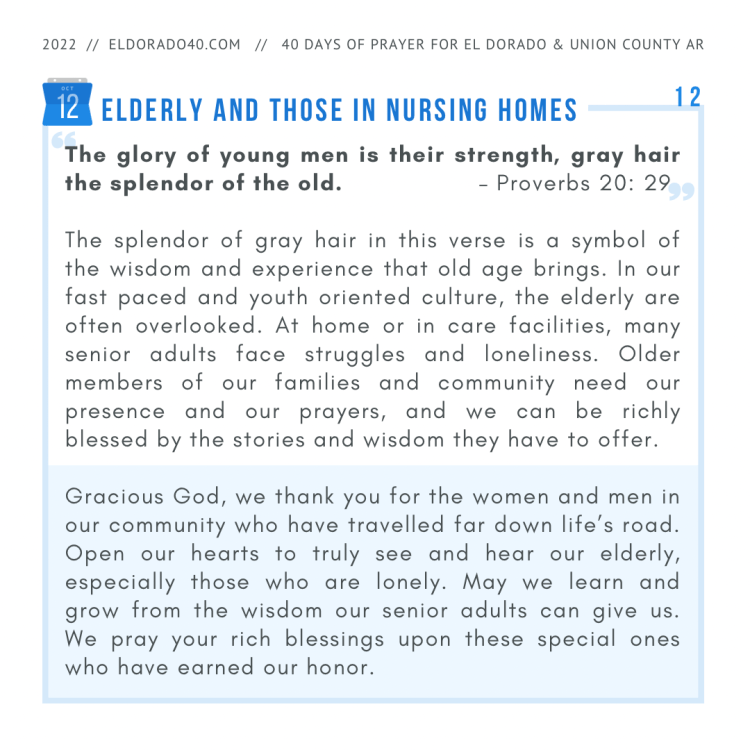 Gracious God, we thank you for the women and men in our community who have travelled far down life’s road. Open our hearts to truly see and hear our elderly, especially those who are lonely. May we learn and grow from the wisdom our senior adults can give us. We pray your rich blessings upon these special ones who have earned our honor.