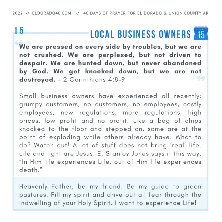 Small business owners have experienced all recently; grumpy customers, no customers, no employees, costly employees, new regulations, more regulations, high prices, low profit and no profit. Like a bag of chips knocked to the floor and stepped on, some are at the point of exploding while others already have. What to do? Watch out! A lot of stuff does not bring ‘real’ life. Life and light are Jesus. E. Stanley Jones says it this way. “In Him life experiences Life, out of Him life experiences death.”