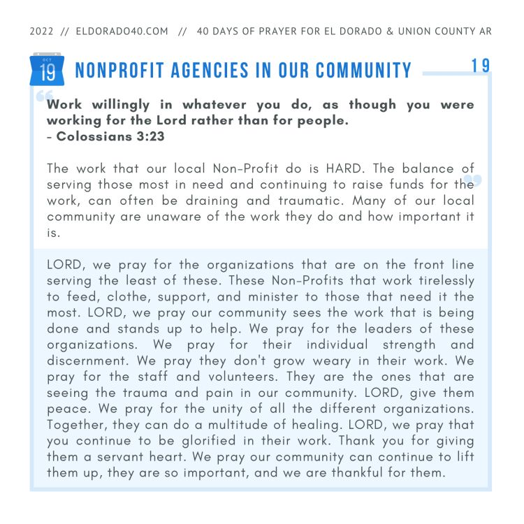 LORD, we pray for the organizations that are on the front line serving the least of these. These Non-Profits that work tirelessly to feed, clothe, support, and minister to those that need it the most. LORD, we pray our community sees the work that is being done and stands up to help. We pray for the leaders of these organizations. We pray for their individual strength and discernment. We pray they don’t grow weary in their work. We pray for the staff and volunteers. They are the ones that are seeing the trauma and pain in our community. LORD, give them peace. We pray for the unity of all the different organizations. Together, they can do a multitude of healing. LORD, we pray that you continue to be glorified in their work. Thank you for giving them a servant heart. We pray our community can continue to lift them up, they are so important, and we are thankful for them.