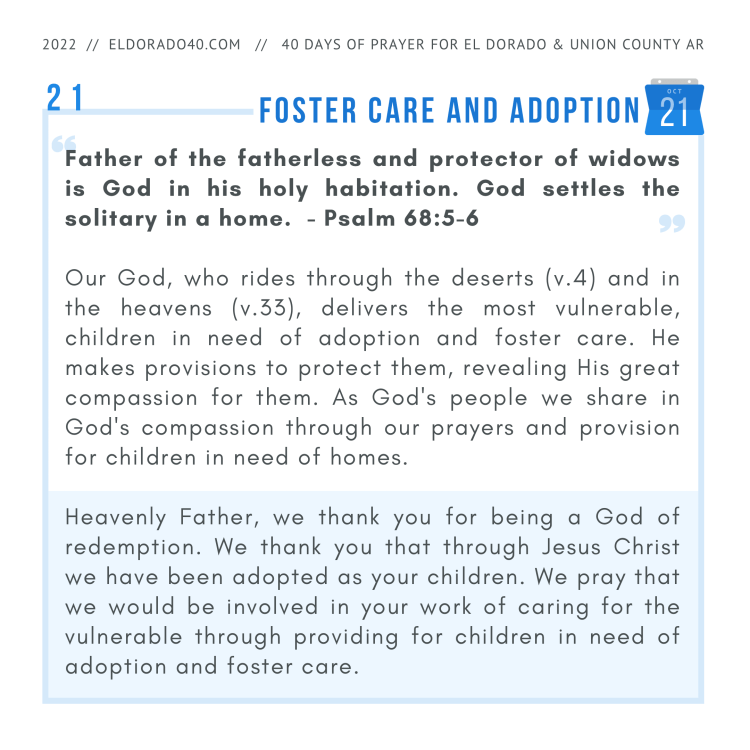 Heavenly Father, we thank you for being a God of redemption. We thank you that through Jesus Christ we have been adopted as your children. We pray that we would be involved in your work of caring for the vulnerable through providing for children in need of adoption and foster care.