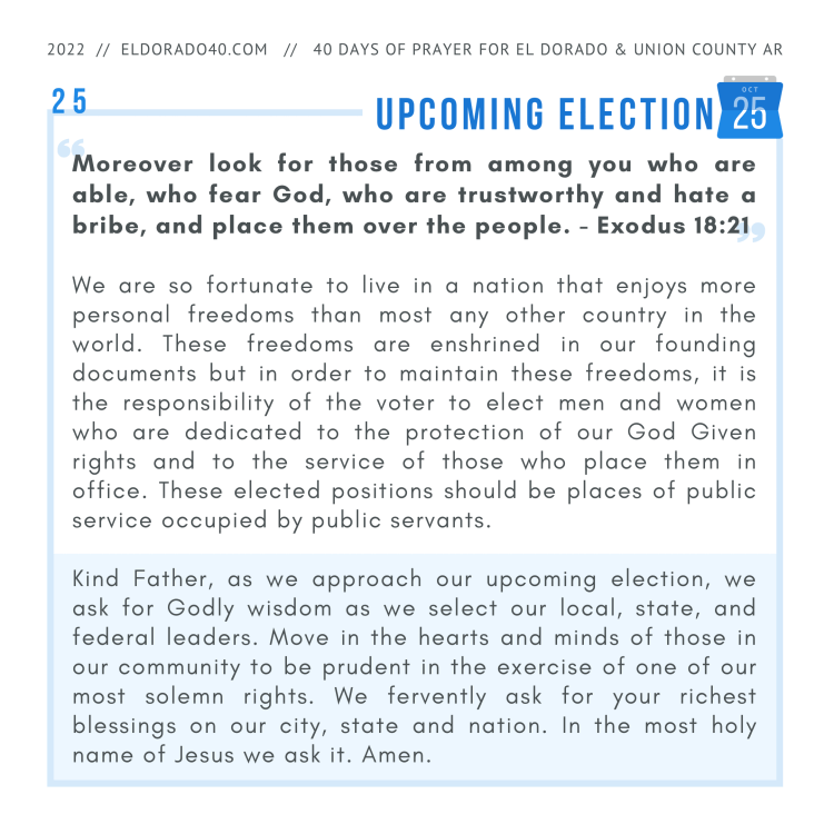 Kind Father, as we approach our upcoming election, we ask for Godly wisdom as we select our local, state, and federal leaders. Move in the hearts and minds of those in our community to be prudent in the exercise of one of our most solemn rights. We fervently ask for your richest blessings on our city, state and nation. In the most holy name of Jesus we ask it. Amen.