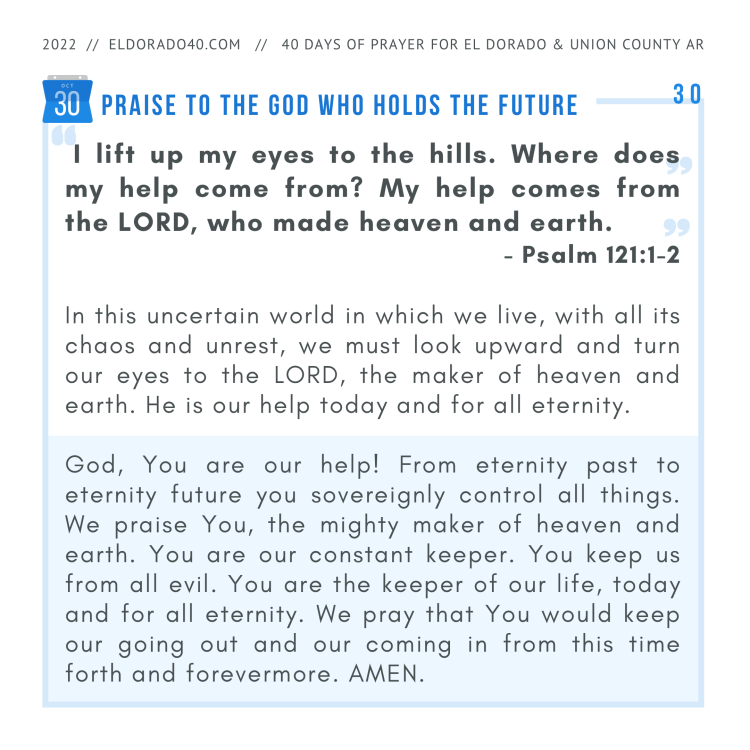 God, You are our help! From eternity past to eternity future you sovereignly control all things. We praise You, the mighty maker of heaven and earth. You are our constant keeper. You keep us from all evil. You are the keeper of our life, today and for all eternity. We pray that You would keep our going out and our coming in from this time forth and forevermore. AMEN.