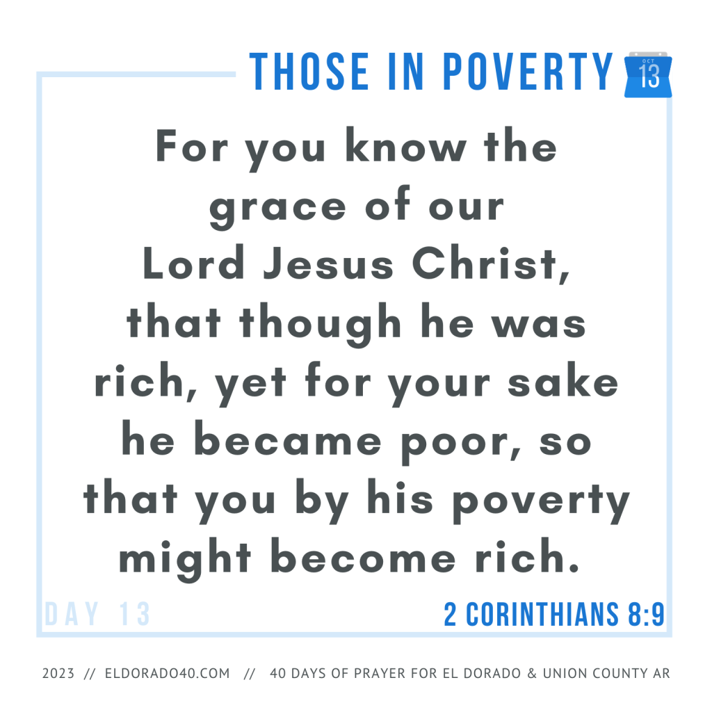 For you know the grace of our Lord Jesus Christ, that though he was rich, yet for your sake he became poor, so that you by his poverty might become rich. – 2 Corinthians 8:9