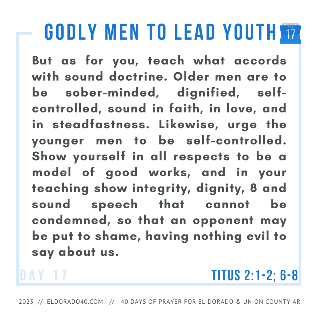 Lord, we’re thankful for the salvation you bring to those who place their faith in you. We also thank you for the Holy Spirit in our lives which enables us to walk in holiness. We pray that our men would be, sober-minded, dignified, self-controlled, sound in faith, in love, and in steadfastness. (v. 2) We pray that they would teach and model good works, integrity, dignity, and sound speech (v. 7-8) to the younger men. Thank you for your grace and mercy in leading us. Amen.