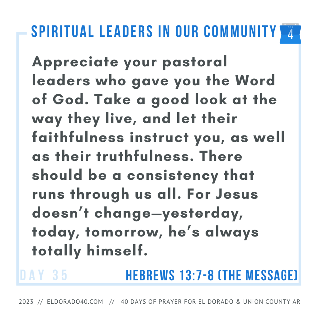 Appreciate your pastoral leaders who gave you the Word of God. Take a good look at the way they live, and let their faithfulness instruct you, as well as their truthfulness. There should be a consistency that runs through us all. For Jesus doesn’t change—yesterday, today, tomorrow, he’s always totally himself. – Hebrews 13:7-8 (The Message)