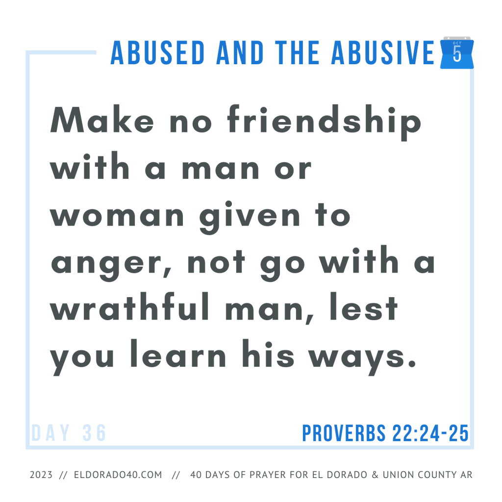 Make no friendship with a man or woman given to anger, not go with a wrathful man, lest you learn his ways. – Proverbs 22:24-25