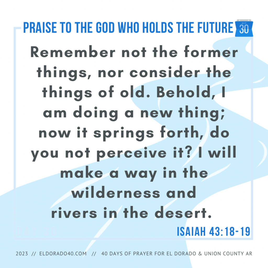 Remember not the former things, nor consider the things of old. Behold, I am doing a new thing; now it springs forth, do you not perceive it? I will make a way in the wilderness and rivers in the desert. – Isaiah 43:18-19