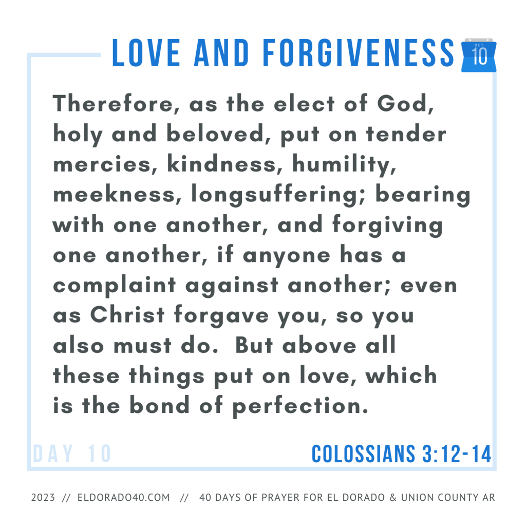 Forgiving others is not debatable for the believer. As hard as it may be, we must remember forgiving others is what we do even as Christ forgave us. Many times, we look for some emotional feeling to verify that we have forgiven, but the reality is, that feeling may not happen. It is the right thing to do, so we forgive. Love, also, may not be easy, but it is the bond of perfection. Think of it as the one thing that holds everything together like glue is a bond.
