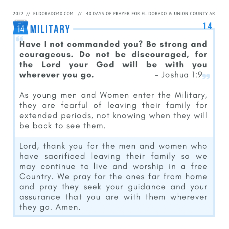 Lord, thank you for the men and women who have sacrificed leaving their family so we may continue to live and worship in a free Country. We pray for the ones far from home and pray they seek your guidance and your assurance that you are with them wherever they go. Amen.