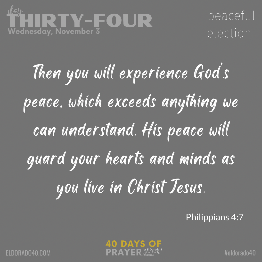 CONSIDER: No matter the outcome of the election, there will be upset, and unrest felt in our country. Let’s be encouraged to pray for peace – a peace that surpasses all understanding (Philippians 4:7). Our nation will need a peace that no matter what disappointments we face, we can trust in the One who has it all worked out and is in our today and tomorrows. We can find hope in a faithful God who promises to be with us. God is in control, and He alone can bring the healing, wisdom, and peace that we long for.